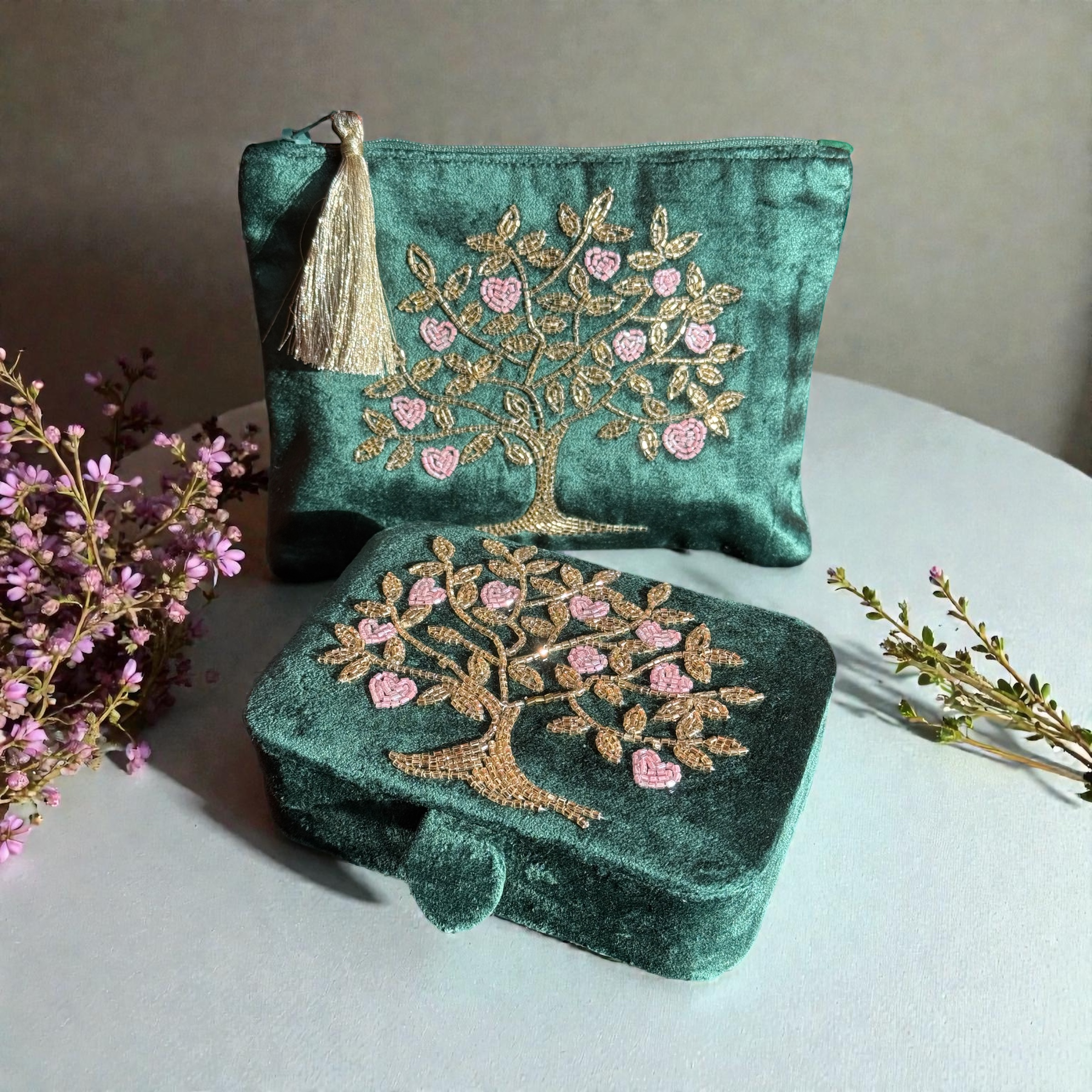 Deze doosjes hebben een zachte fluwelen buitenkant met verfijnd borduurwerk, waardoor ze zowel mooi als functioneel zijn voor het opbergen van kleine schatten. Er zijn prachtige bloemen en pailletten op geborduurd. De rijke kleuren en elegante details geven ze een unieke uitstraling in elke collectie.