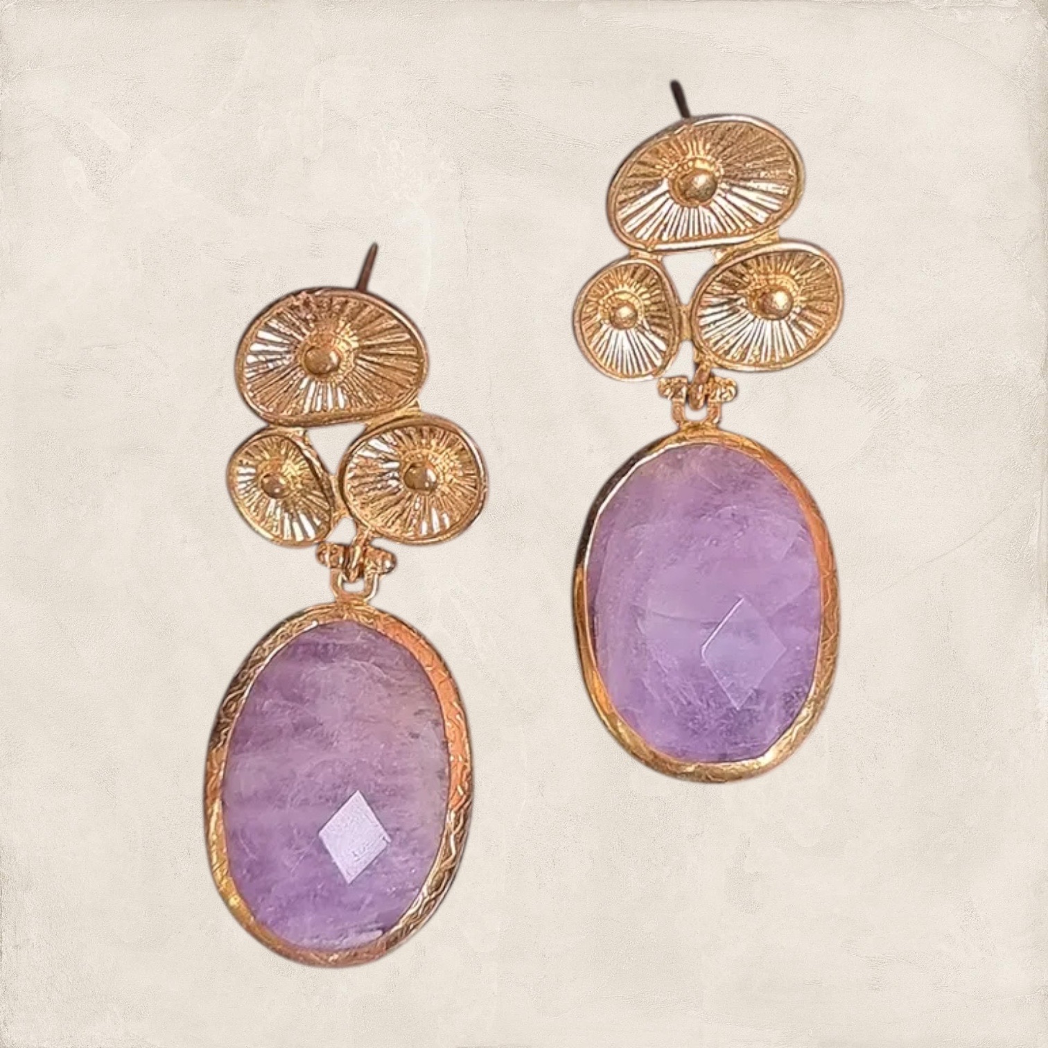 Prachtige oorbellen van de onderlaag messing en dan goud 24K verguld. De bedel is van Edelsteen: Amethist. Ze zijn totaal 5 cm lang.
