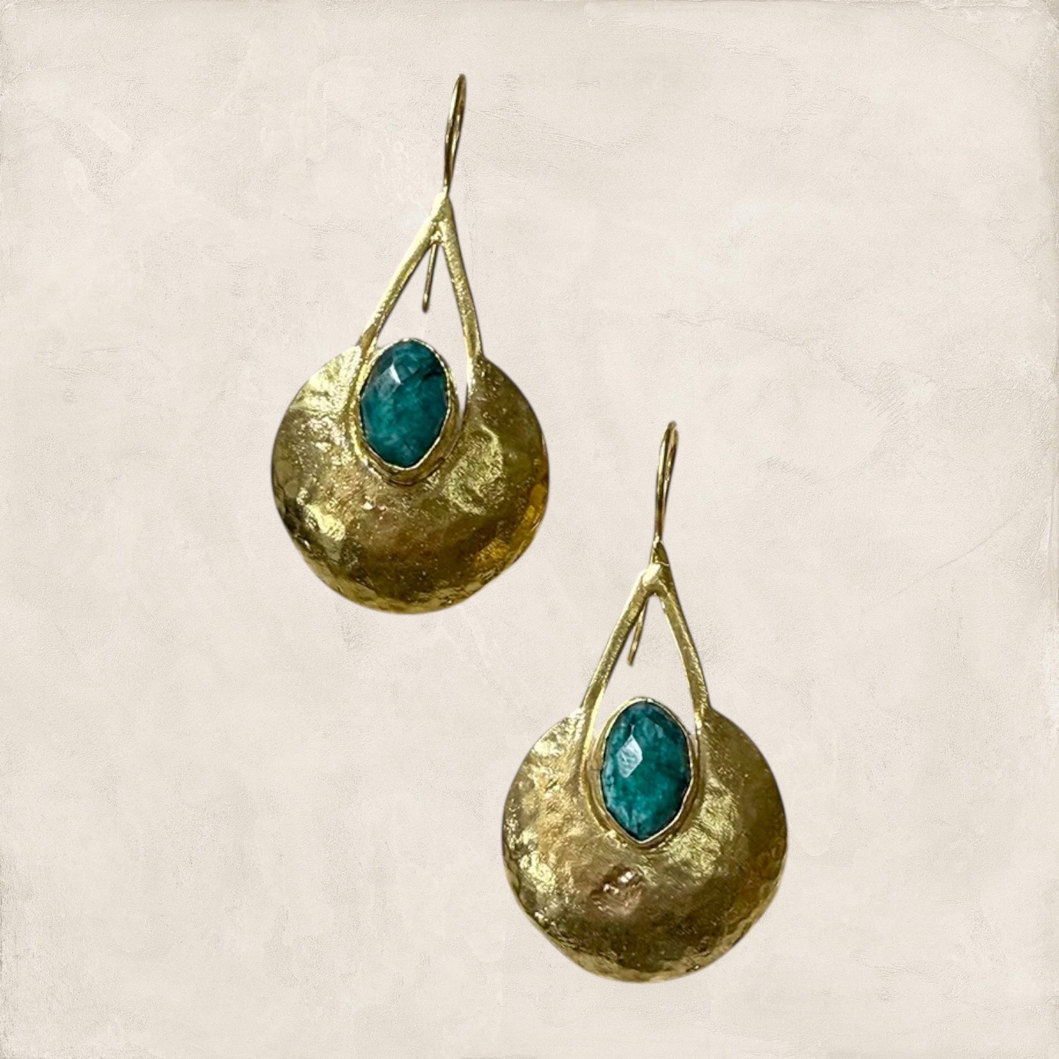 Prachtige oorbellen van de onderlaag messing en dan goud 24K verguld. Met Edelsteen: Apatiet. Ze zijn totaal 5 cm lang.