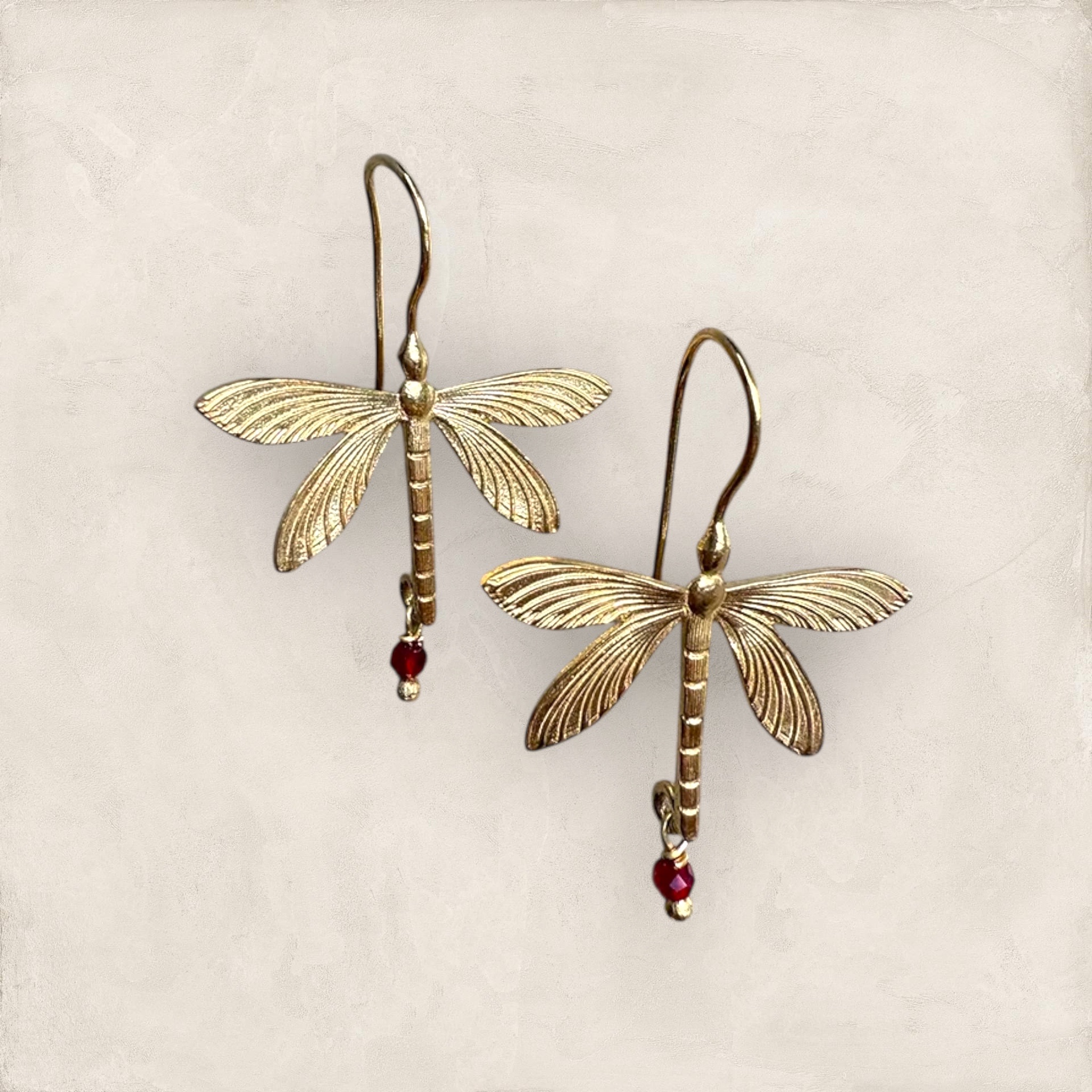 Prachtige Libellen oorbellen. De onderlaag is messing en dan goud 24K verguld. Het rode steentje is een Edelsteen: Granaat . Ze zijn totaal 4 cm lang.