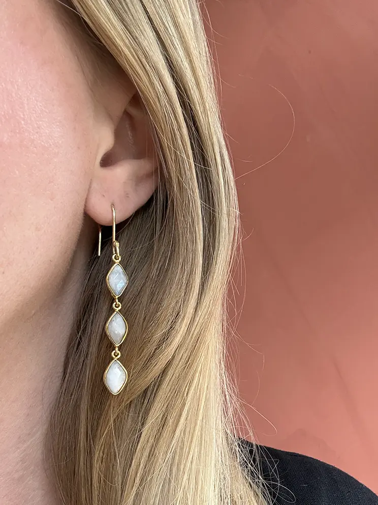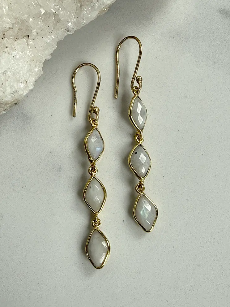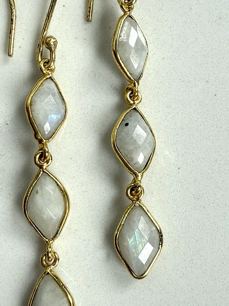 Prachtige oorbellen. De onderlaag is messing en dan goud 24K verguld. De steen is een Edelsteen: Maansteen. Ze zijn totaal 6,5 cm lang.