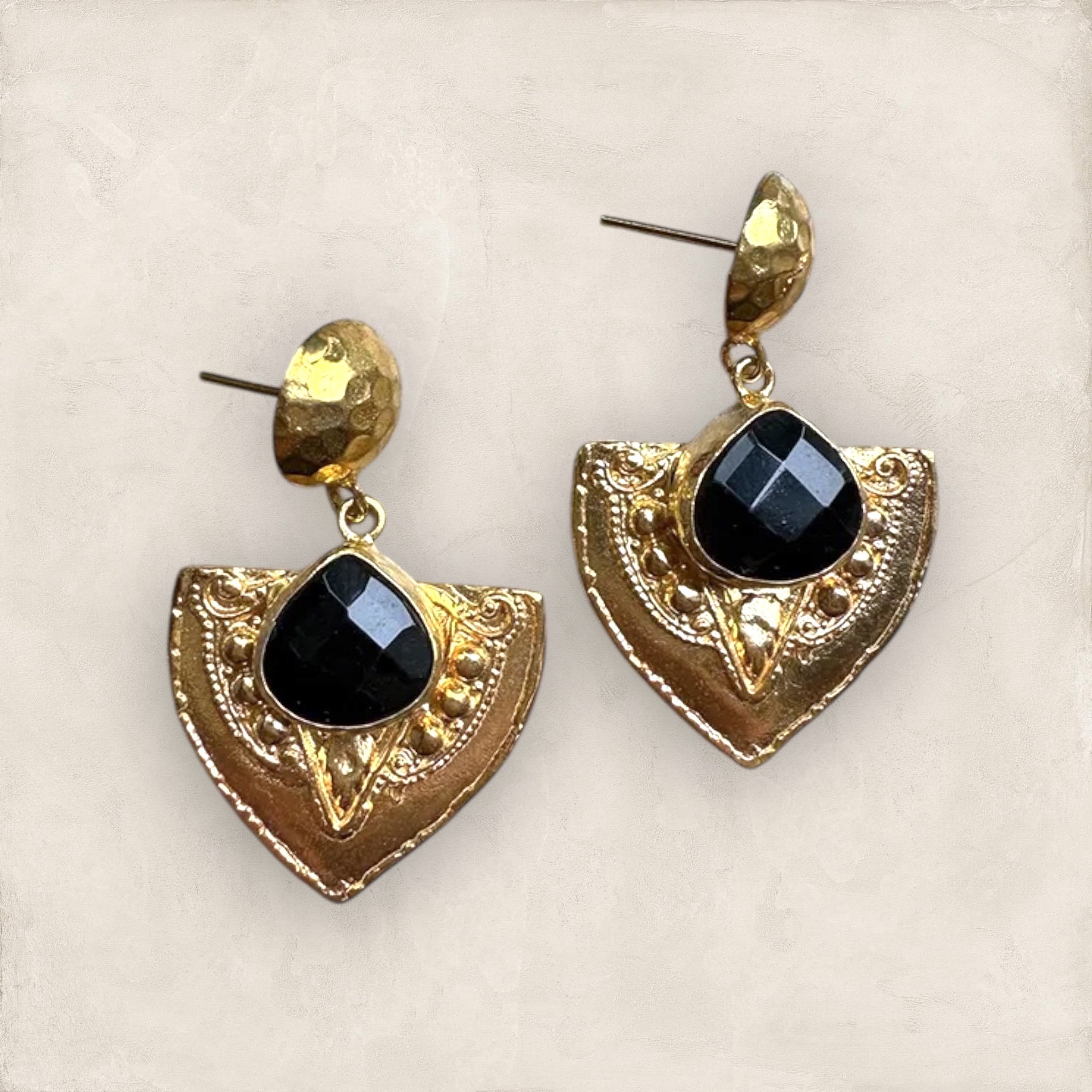 Prachtige oorbellen. De onderlaag is messing en dan goud 24K verguld. De zwarte steen is een Edelsteen: Obsidiaan . Ze zijn totaal 5 cm lang.