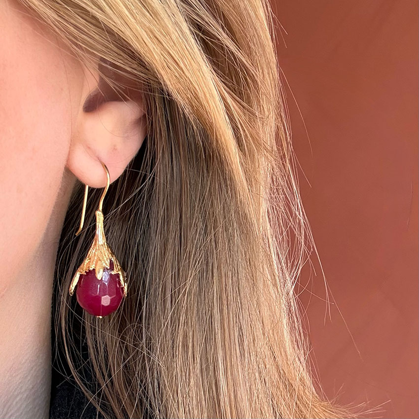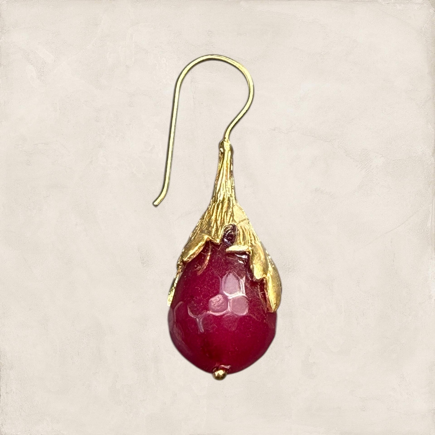 Prachtige oorbellen van de onderlaag messing en dan goud 24K verguld. De druppelvormige rood/roze steen is een Edelsteen: Robijn. Ze zijn totaal 5 cm lang.