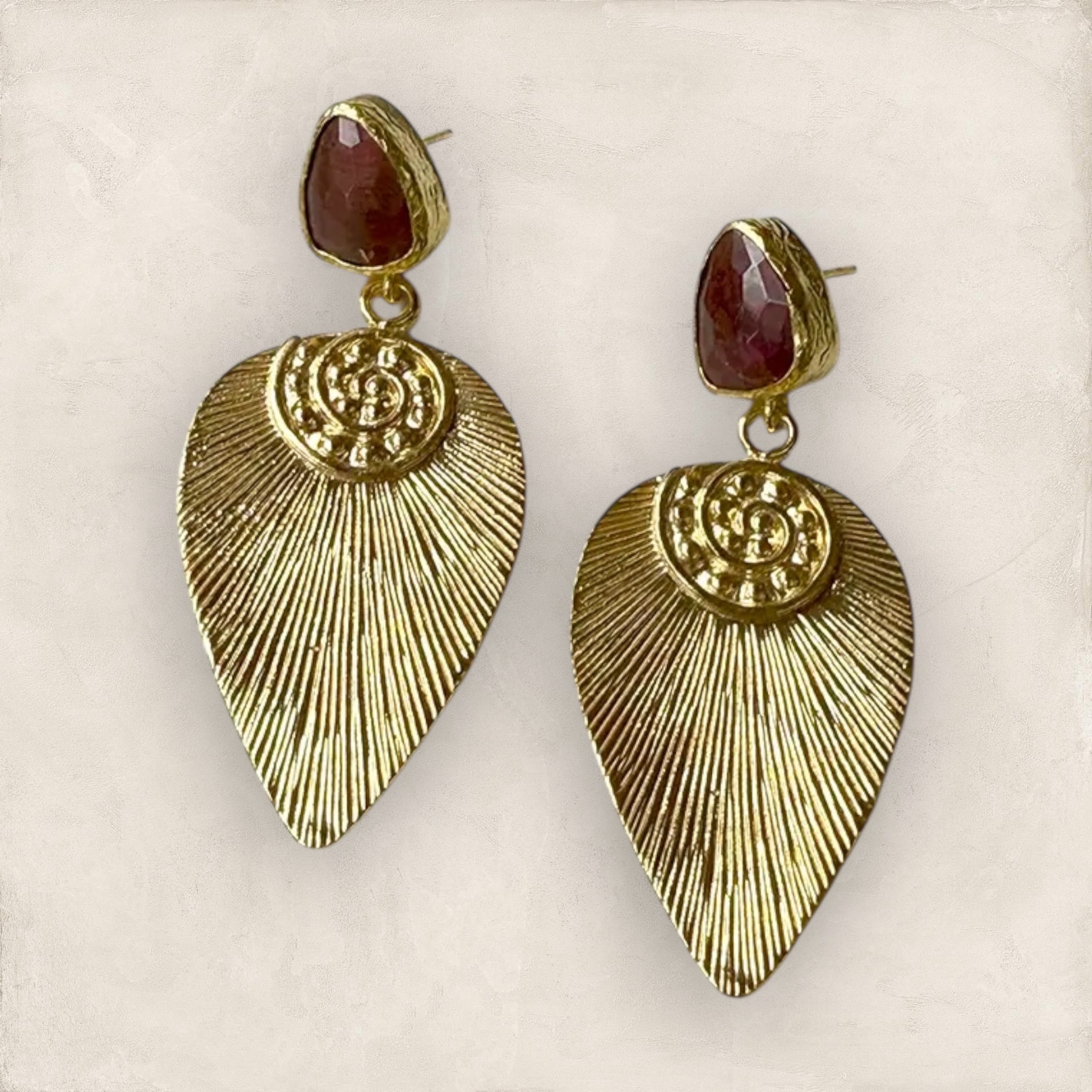 Prachtige oorbellen. De onderlaag is messing en dan goud 24K verguld. De rode steen is een Edelsteen: Robijn. Ze zijn totaal 7 cm lang.