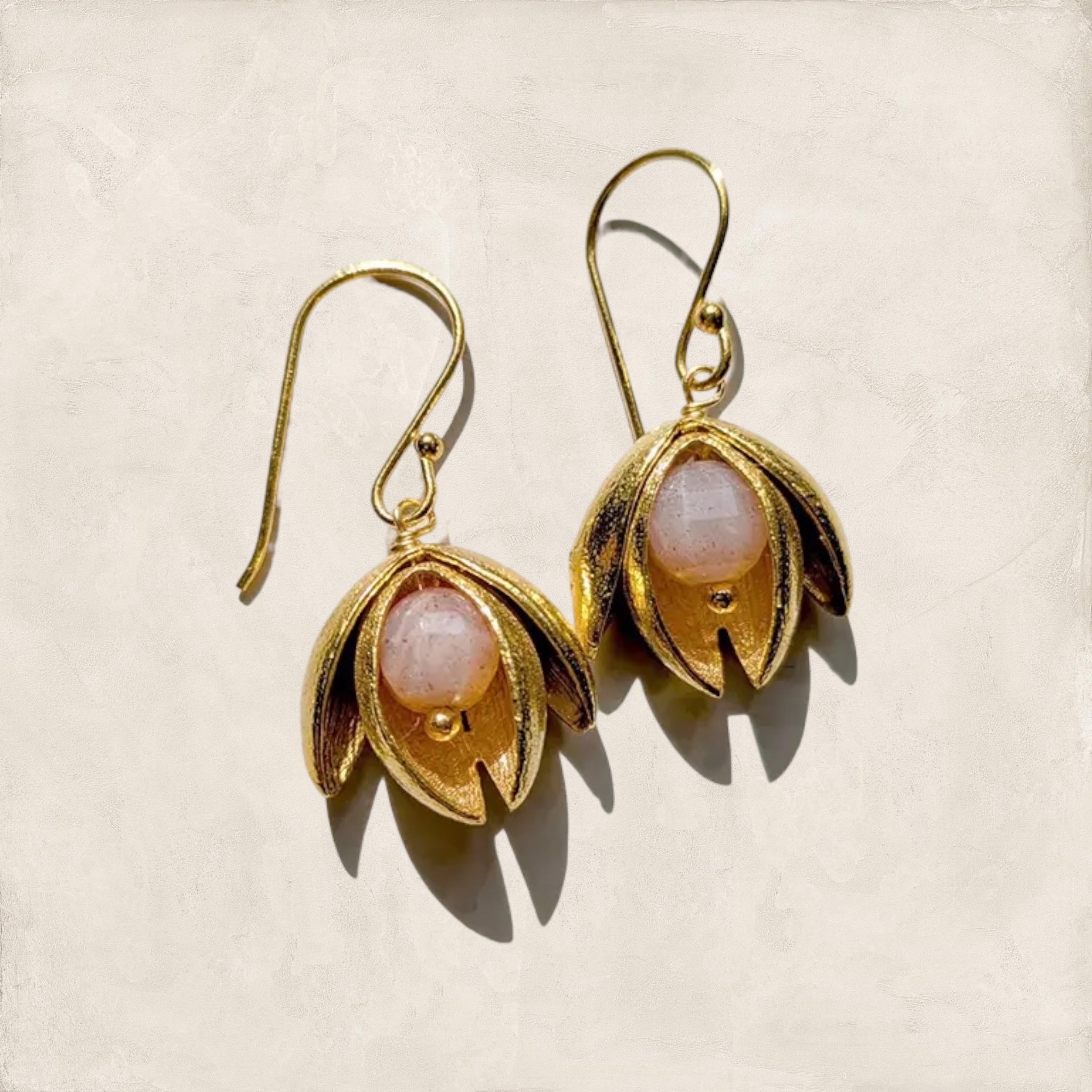 Prachtige oorbellen. De onderlaag is messing en dan goud 24K verguld. De roze steen is een Edelsteen: Zonnesteen. Ze zijn totaal 4 cm lang.