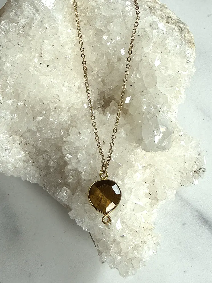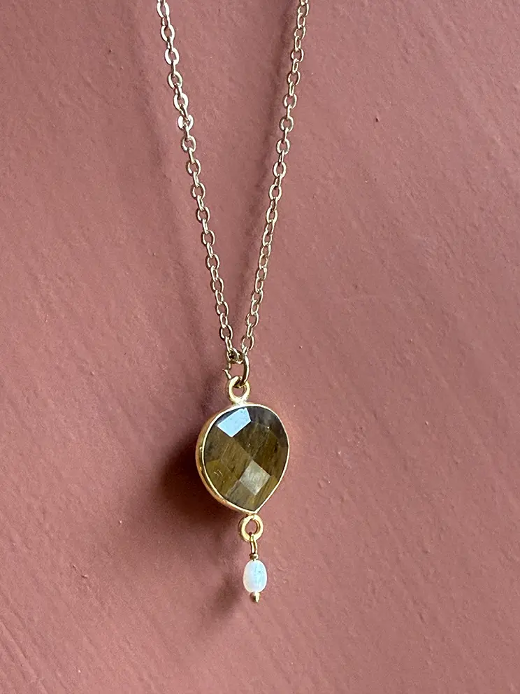 Prachtige ketting van de onderlaag messing en dan goud 24K verguld. De facet geslepen steen is een Edelsteen: Tijgeroog, met een bedeltje van Zoetwaterparel. De hanger is 2,5 cm groot.